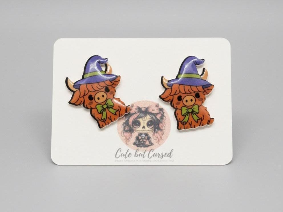 These Witchy Highland Cow Earrings are too cute to resist—playful cows dressed in purple witch hats and green bows, ready to add some spooky-sweet charm to your outfit! 🐮🧙♀️✨