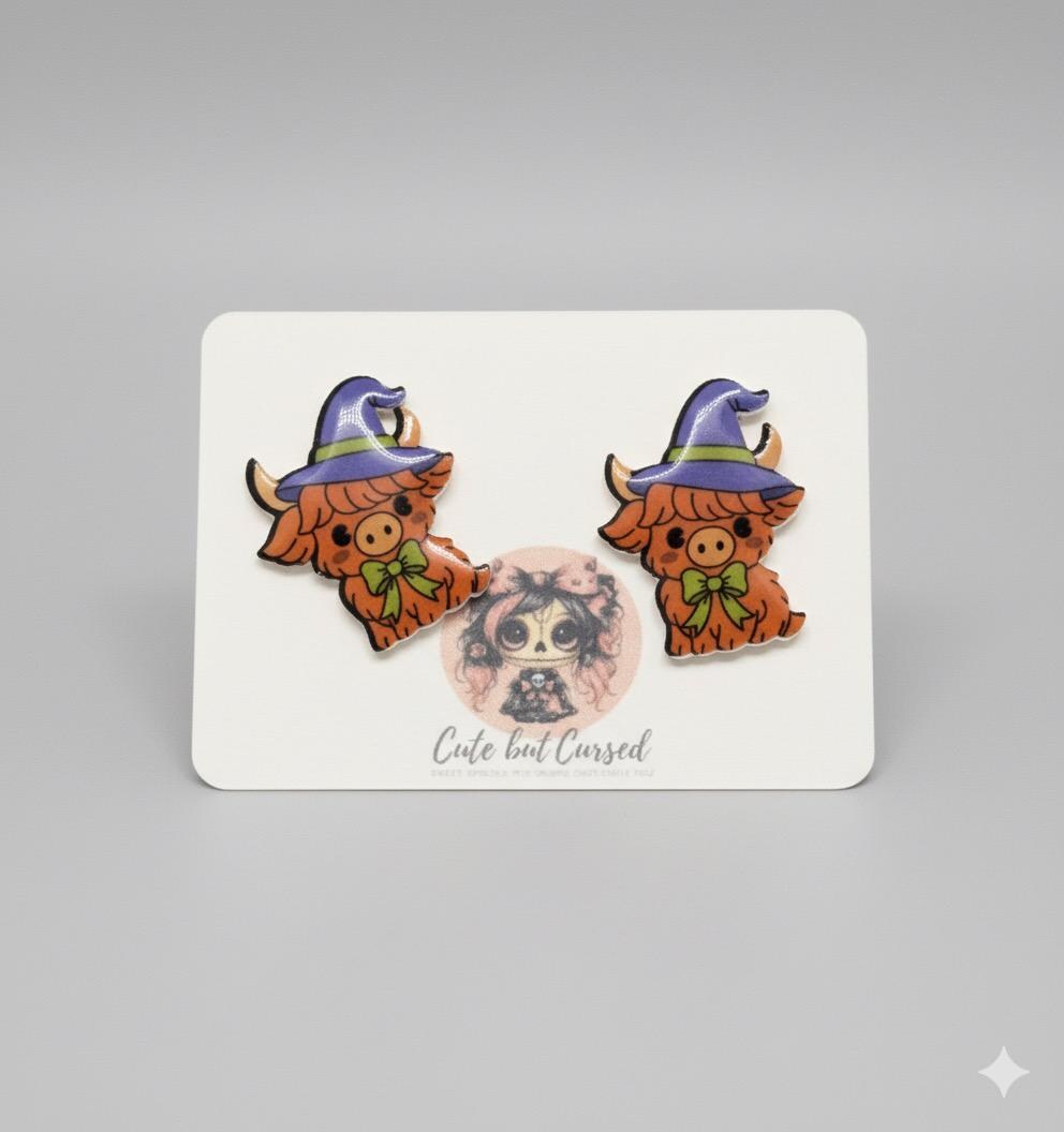 Witchy Highland Cow Earrings – Spooky Cute Halloween Jewelry (Imperfect Sale)