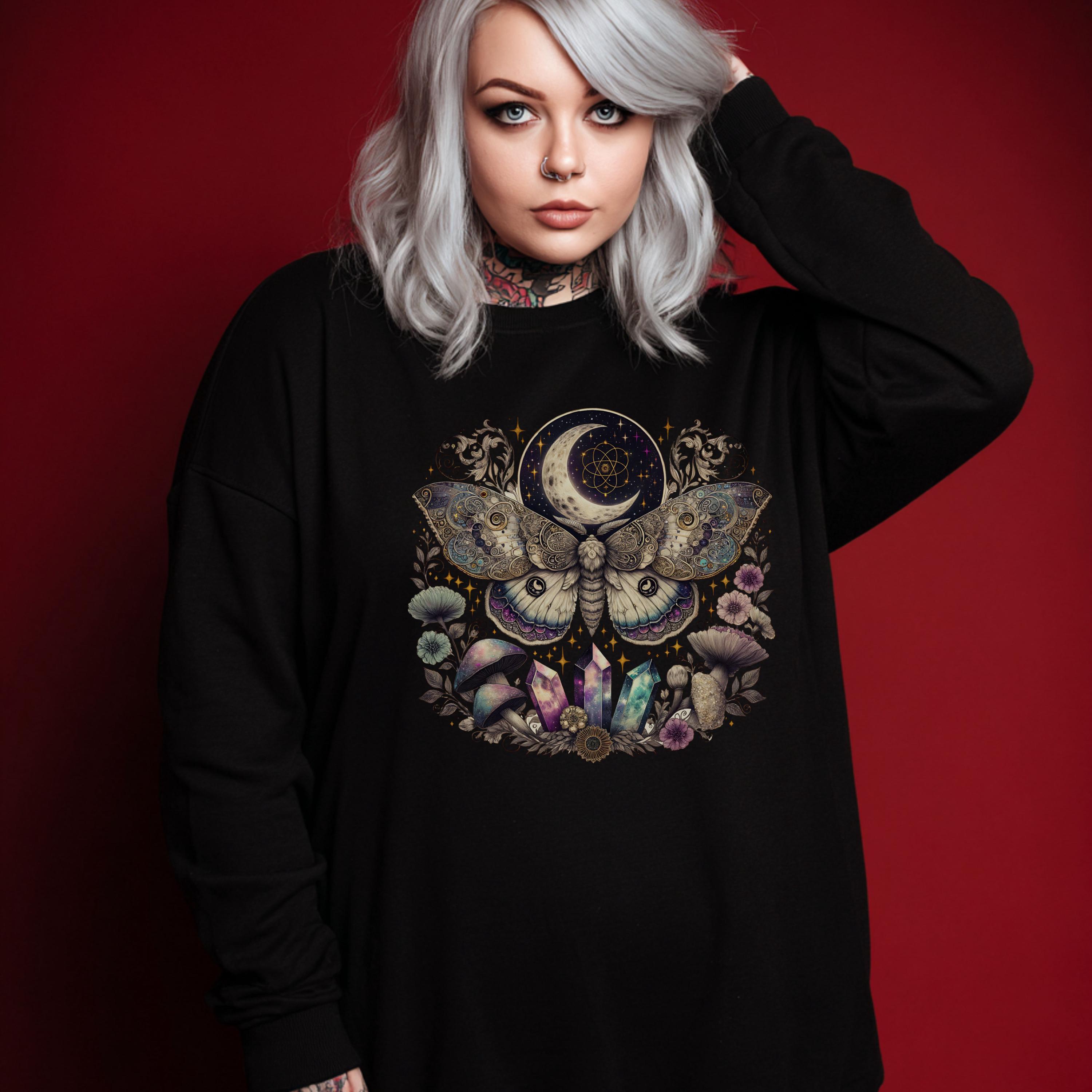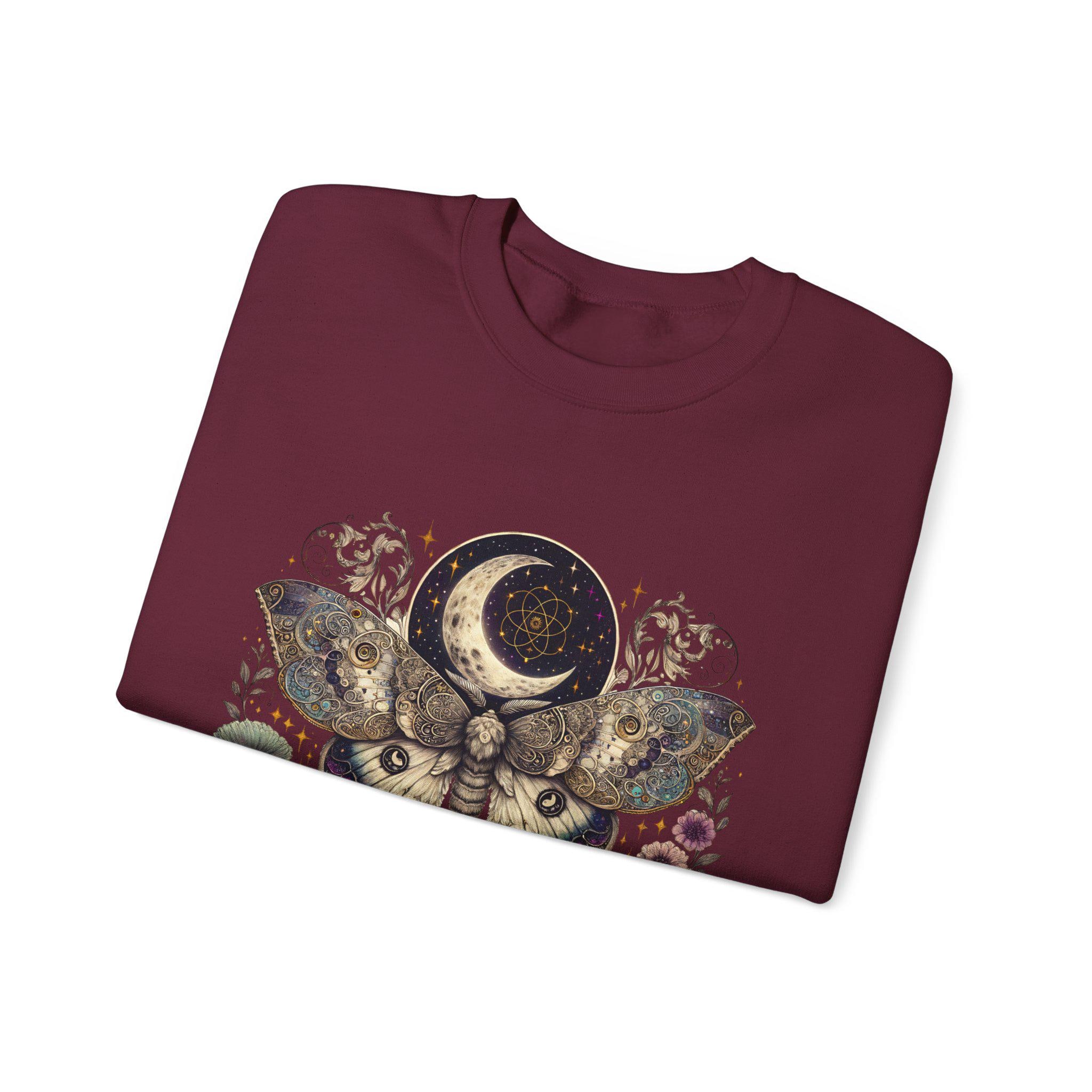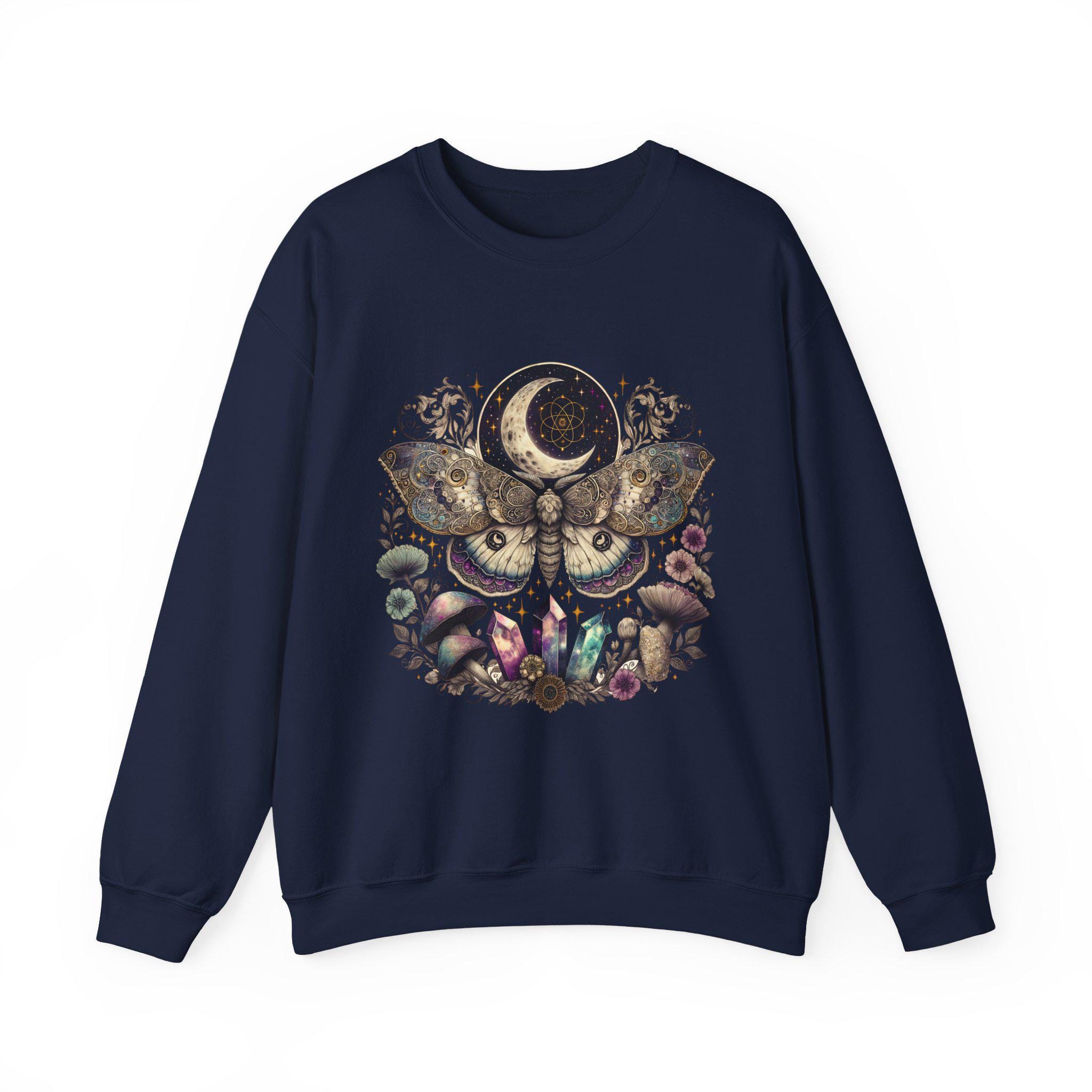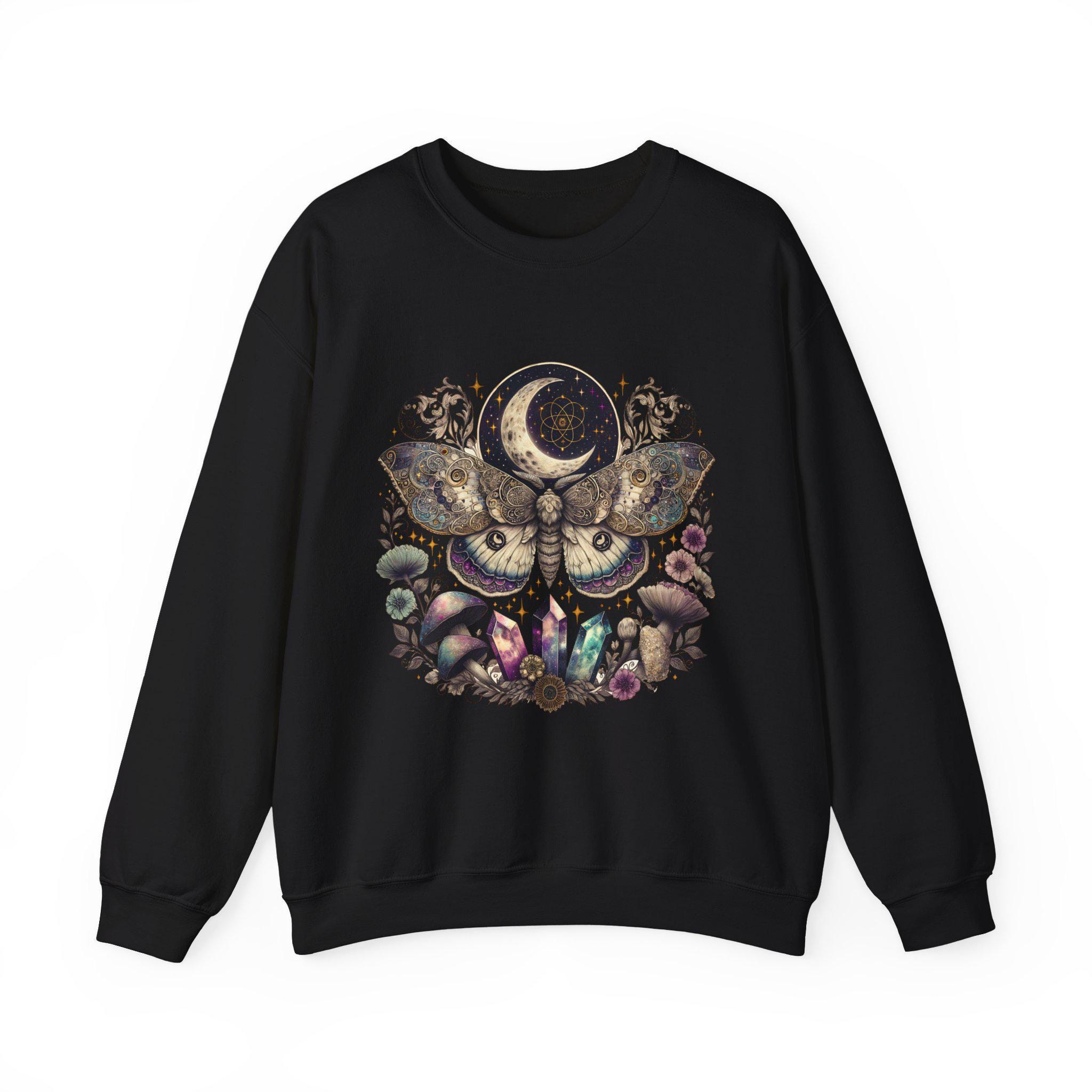 A cozy unisex crewneck sweatshirt featuring a mystical butterfly design, perfect for nature lovers. This sweatshirt is ideal for all occasions, providing a unique and eye-catching look. It offers comfort and durability, making it a versatile addition to any wardrobe. Target audience includes adults seeking a nature-inspired and stylish sweatshirt.